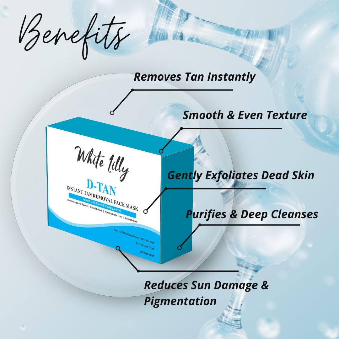 The White Lilly D-TAN Instant Tan Removal Face Mask is your go-to solution for fresh, clean, and visibly brighter skin—perfect for everyday skincare and quick glow-ups.