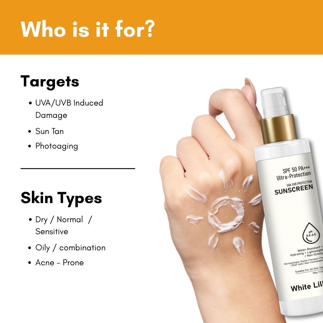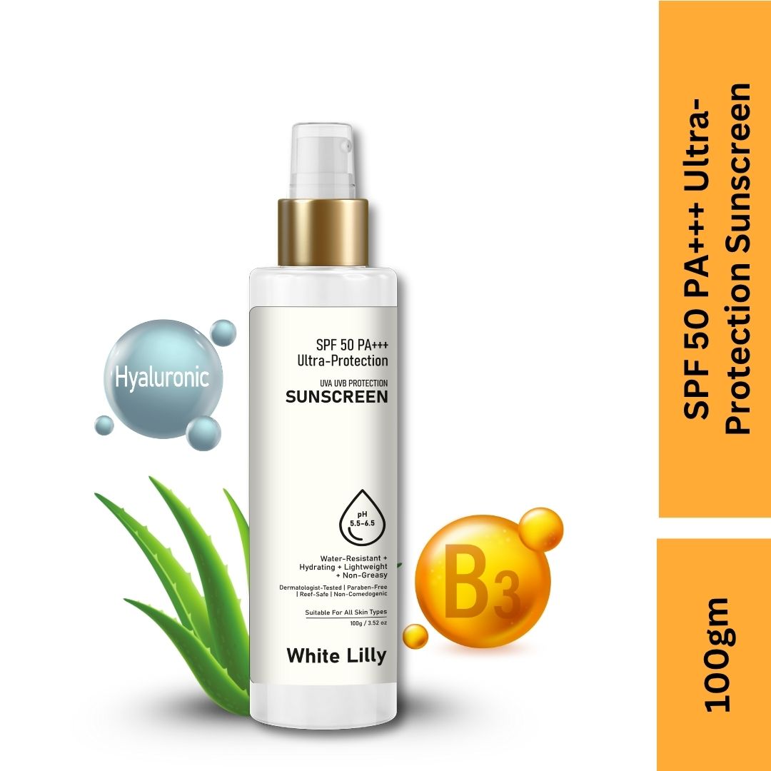 Protect your skin every day with the White Lilly Sunscreen SPF 50 PA+++ Lotion. This lightweight, non-greasy sunscreen offers broad-spectrum UVA and UVB protection while keeping your skin hydrated and comfortable. Designed for daily use, it spreads easily like a moisturiser and leaves no white cast or heavy residue—perfect for Indian weather and routine skincare.